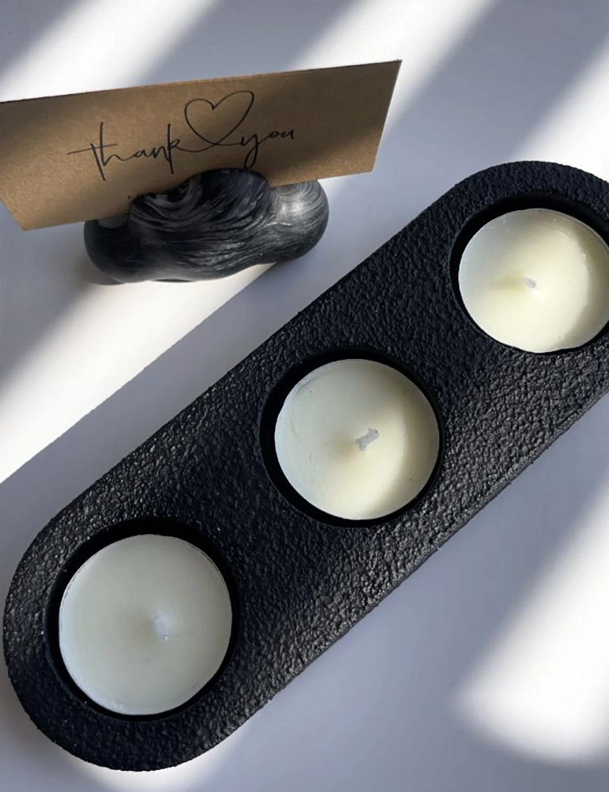 Ručno izrađen Jesmonite držač za tri svećice, dostupan u boji po želji, sa teksturom ili glatkom završnicom. Unesite dozu elegancije i topline u svoj prostor uz ručno rađeni Jesmonite držač za tri čajne svećice. Modernog, zaobljenog oblika, ovaj komad savršeno kombinuje funkcionalnost i estetiku.